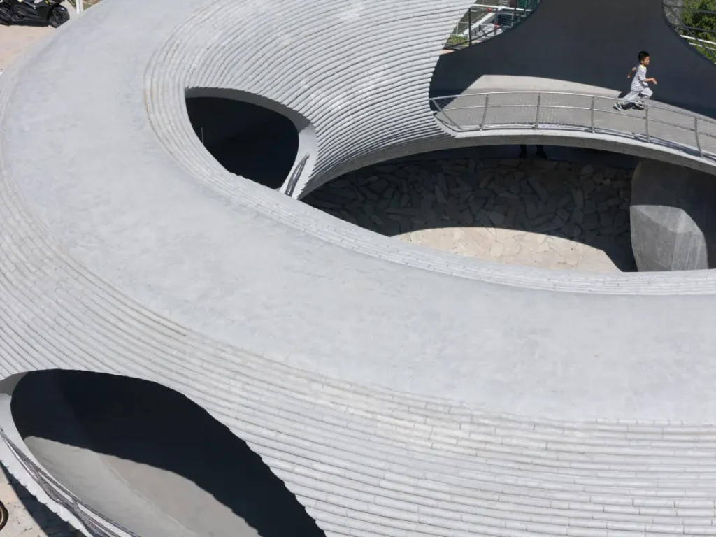 El pabellón destaca a la vista por su particular figura, similar a “una dona o a un platillo volador”, ejemplificaron desde el estudio. Asimismo, los arquitectos decidieron utilizar hormigón para dar forma a esta idea. “Esta ‘dona’ de concreto poroso vuela bajo sobre una la plataforma de piedra, presentando escenarios diversificados en niveles dobles”, puntualizaron desde el estudio.