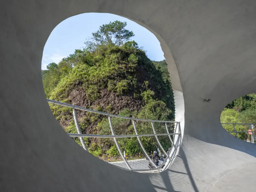 El proyecto se ejecutó con especial cuidado para afectar en lo mínimo al paisaje natural colindante. Para ello, la superficie exterior se vertió in situ en encofrados de bambú con textura en relieve, con aproximadamente 7 centímetros de diámetro en su sección. “La sección inferior, por otra parte, es suave y continua, creando una experiencia abstracta y trascendental”, subrayaron los arquitectos. Ambos acabados, agregan, se diferencian en el borde de los cortes ovalados, donde el corte en forma de volante resalta “el protagonismo de la textura tipo bambú”, puntualizaron desde el estudio.