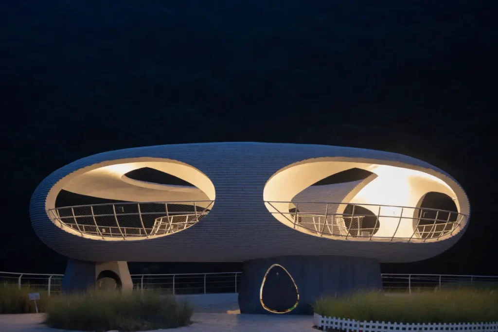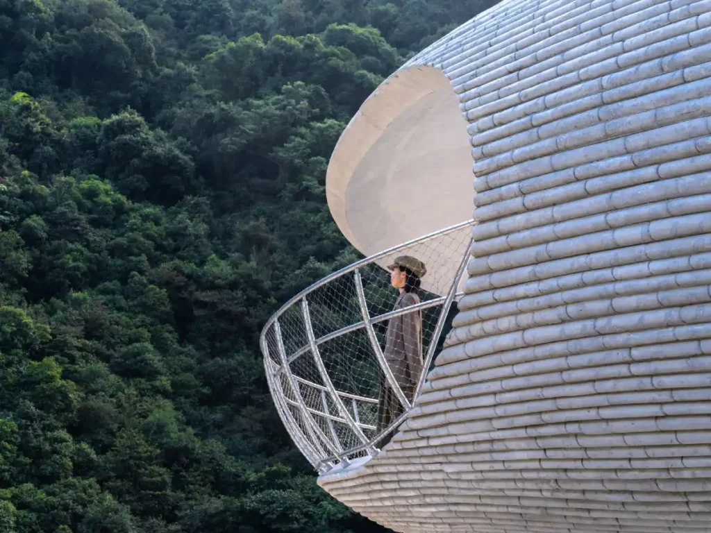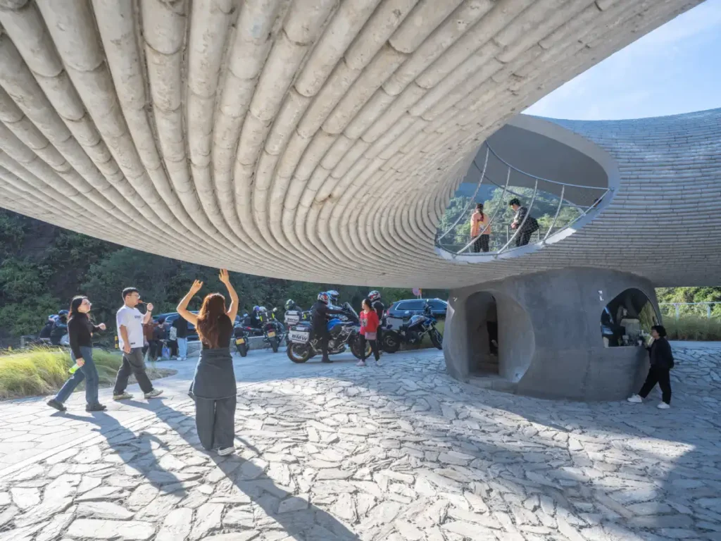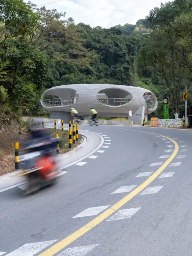 Emplazado en la zona montañosa del condado de Boluo, al norte de Hong Kong, y rodeado por un paisaje lleno de bosques, este pabellón del estudio de arquitectura HCCH Studio se convirtió en un atractivo turístico por su particular forma, similar a la de un platillo volador o de una dona, con la salvedad que está fabricado completamente de hormigón.