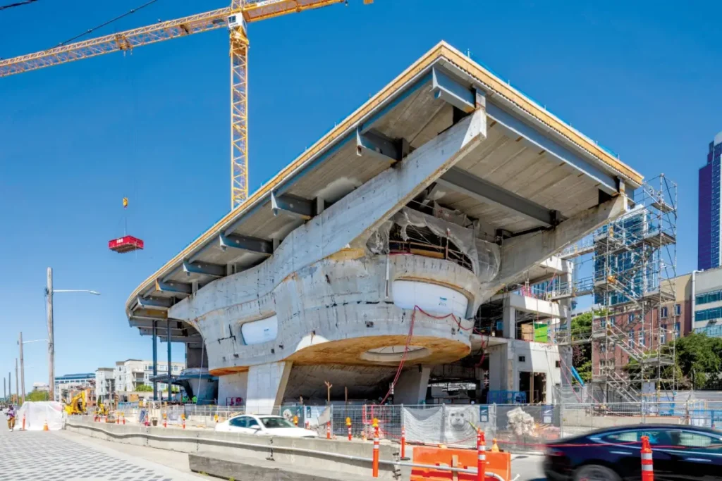 La estructura principal del tanque del Pabellón Oceánico funciona a la vez como el sistema lateral y de gravedad principal del edificio, sostiene la plaza de la azotea y establece nuevos estándares en el diseño de hormigón.