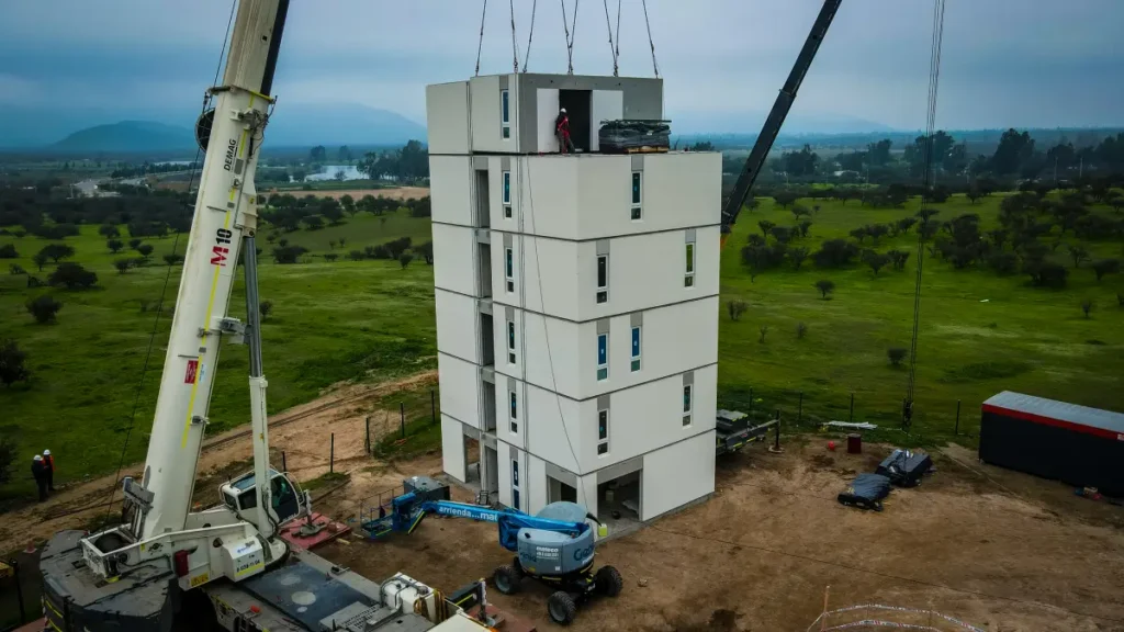 La instalación de los módulos se inició a las 9:00 de la mañana y cuando el día terminó, un edificio de seis pisos y 16,5 metros de altura se erguía donde horas antes solo había una fundación. Dieciocho módulos. Un día. Un experimento en hormigón armado que busca cambiar la forma de construir en Chile.