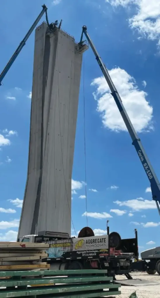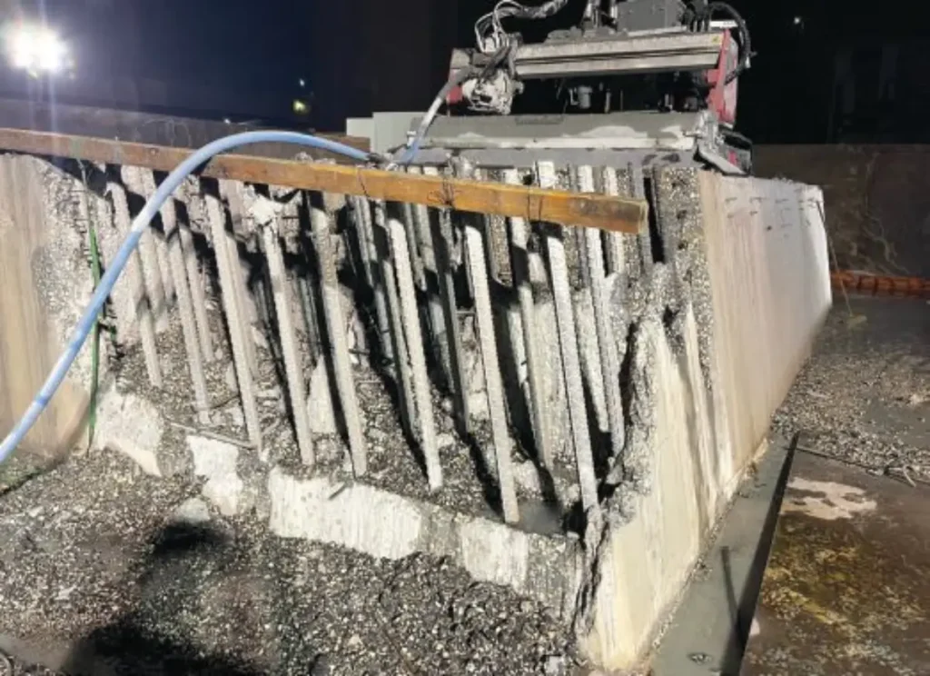 Cada estructura, con muros de hormigón armado de 0,6 metros de espesor, era hueca y estaba segmentada en 25 bloques que pesaban aproximadamente 18.144 kg cada uno. El enfoque de demolición integró hidrodemolición robótica, perforación de núcleos y corte con sierra de alambre, con un fuerte énfasis en preservar el refuerzo embebido y minimizar el impacto ambiental (Fig. 2).