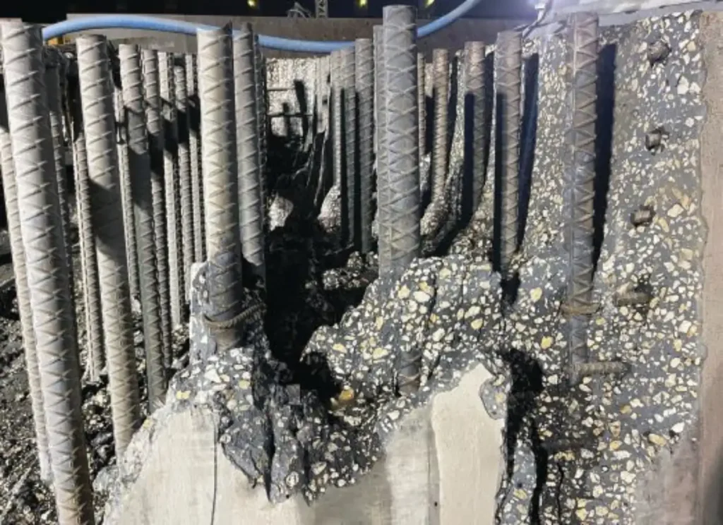 Los últimos 1,5 metros de cada pilón requirieron cuidado adicional. Estas secciones inferiores se convertirían en la fundación para nuevas columnas una vez que comenzara la reconstrucción. La hidrodemolición permitió a las cuadrillas remover el hormigón sin dañar el refuerzo, asegurando continuidad con el trabajo futuro (Fig. 5).