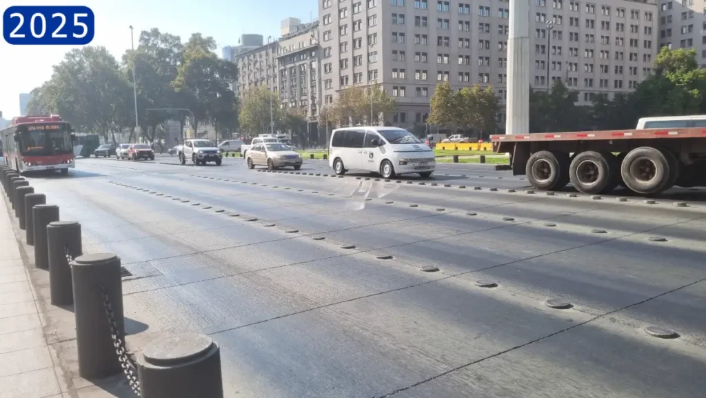 En la Plaza de la Ciudadanía, justo frente al Palacio de La Moneda, se encuentra uno de los tramos más emblemáticos de losas de geometría optimizada en Chile. Construido en 2014, este pavimento ha resistido el paso de los años, el peso de miles de buses y vehículos, y las exigencias de uno de los puntos más transitados de la capital.