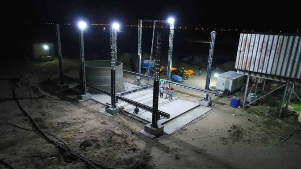 El caso del estanque para agua potable -el primero del mundo en su tipo en ser construido con tecnología de hormigón impreso 3D- es ligeramente opuesto al de los elementos fabricados en Kuwait, partiendo por su uso final. Junto con eso, sus dimensiones ligeramente más grandes (8 metros de diámetro y 7,5 de alto) y su capacidad (300 metros cúbicos) presentaron desafíos distintos al proyecto que se realizó en Oriente Medio.