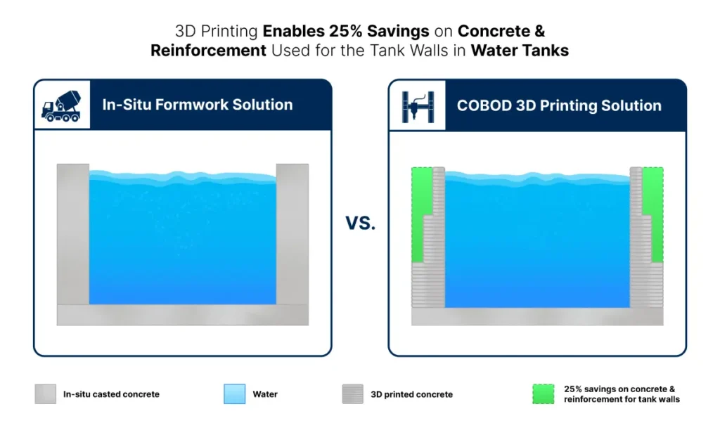 Así, los estanques de hormigón impreso 3D en Kuwait tienen espesores de muros de 40 cm en la parte más baja, 30 en la sección media y 20 centímetros en la parte alta, lo que a la postre significó un ahorro de un 25% de hormigón y refuerzo utilizado para este proyecto, comparado con un estanque de hormigón construido bajo metodología tradicional con muros de 40 cm de espesor.